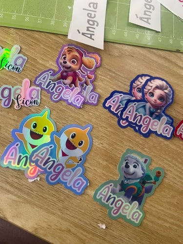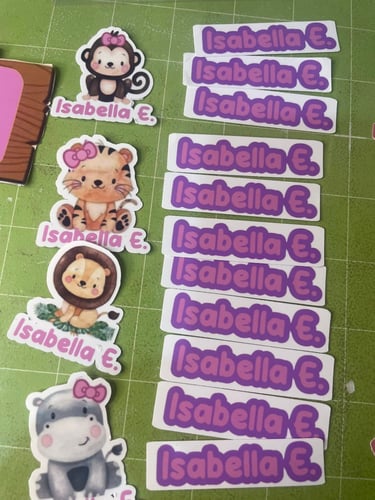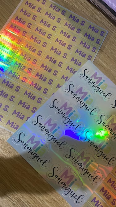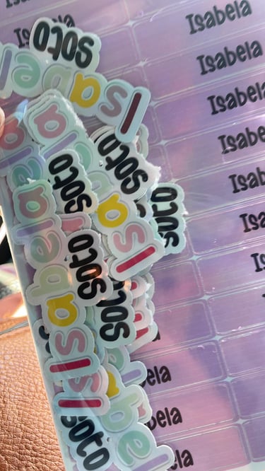 Etiquetas personalizadas con nombre y diseño único, ideales para útiles, regalos, organización y objetos personales, creadas con materiales de calidad y acabados delicados.
